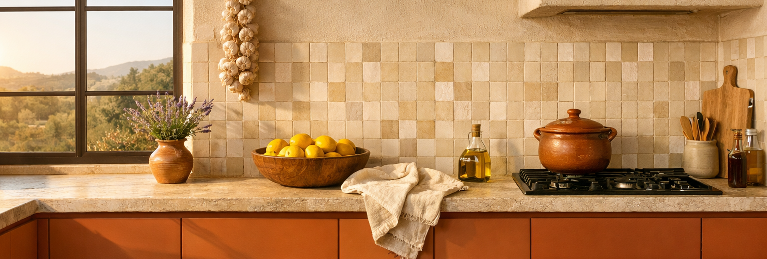 Le style méditerranéen est peu traité dans les guides de rénovation de cuisine — et pourtant, une grande partie des cuisines Cuisinella sont installées dans le Sud de la France, dans des maisons aux murs enduits, aux sols en tomettes et aux ouvertures généreuses. Ce style associe des teintes épicées et terracotta à des verts sages et des crèmes chauds, dans un registre ensoleillé et généreux qui amplifie la lumière naturelle.