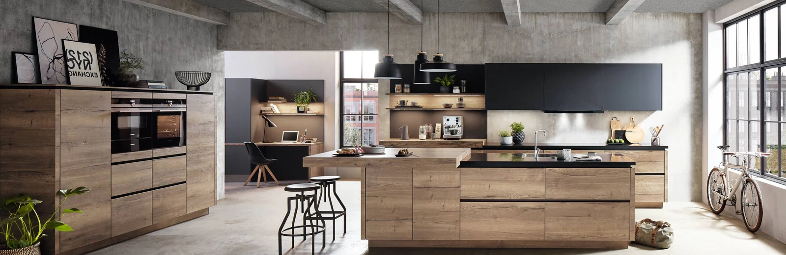 Le secret d'une cuisine industrielle réussie ? Marier le métal froid avec la chaleur du bois.